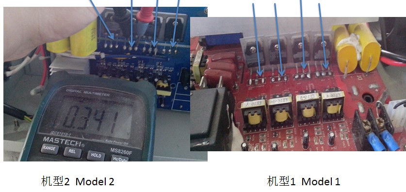 2.如图测量4只IGBT管,正常值为0.3-0.5,值为0.0 IGBT坏,需更换